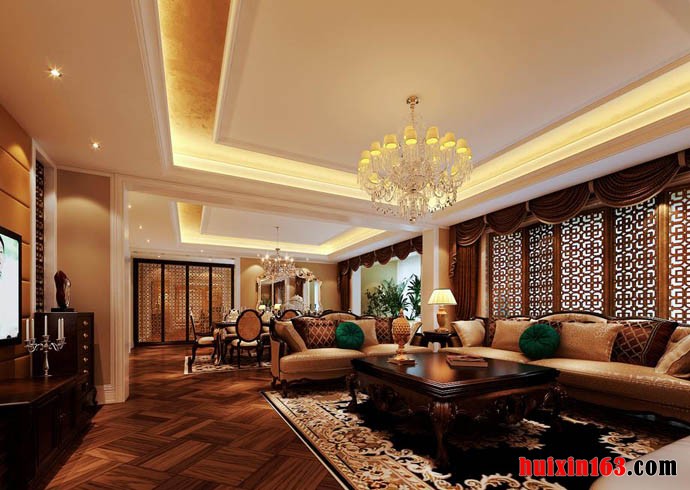 万正西区,170平米三居室,采用新古典的装修风格,在本案例的设计当中,不管是色彩的搭配还是造型的设计都显得比较稳重时尚,例如客厅的布局设计,采用双层石膏板粘贴吊顶,其背景色彩虽说是以白色为主,但通过夹层内黄色灯带的营造,演绎出一种暖色系的温馨效果,一盏华丽的水晶吊灯搭配,在新古典的氛围当中展现出一种高调的奢华美感,个性的沙发背景墙设计,搭配上工艺别致的窗帘,实木打造的屏风完美的将古典的韵味展现的淋漓尽致,一盏富有古典文化气息的台灯安装,实木茶几的添置,迎面就能感受到浓重的古典气息,而开放式的餐厅设计,在视觉上还有着一种扩大空间面积的效果。