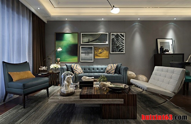 本案例的装修设计采用的是现代简约的装修风格,通过设计师独具匠心的设计,打造出一个前卫并且回归自然的感觉,通过低调的布置却又展现出一种奢华的味道,整个空间装饰都有一种跳跃性的色彩搭配,将具有时尚魅力的元素融于其中,打造出一个独特的居室环境,例如客厅的布置,采用平顶式的石膏板吊顶,其背景色彩以白色为主,而沙发的色彩以白色和孔雀蓝为主,实木打造的茶几,色彩不一的壁画悬挂,灰蓝色的窗帘布置,实木铺设的地板以及一种灰色的地毯搭配,将空间点缀出一种具有独有的艺术气息,展现出个性的同时也不缺乏深度,从而演绎出一个不一样的居室空间。