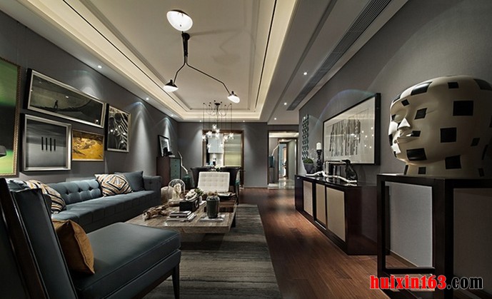本案例的装修设计采用的是现代简约的装修风格,通过设计师独具匠心的设计,打造出一个前卫并且回归自然的感觉,通过低调的布置却又展现出一种奢华的味道,整个空间装饰都有一种跳跃性的色彩搭配,将具有时尚魅力的元素融于其中,打造出一个独特的居室环境,例如客厅的布置,采用平顶式的石膏板吊顶,其背景色彩以白色为主,而沙发的色彩以白色和孔雀蓝为主,实木打造的茶几,色彩不一的壁画悬挂,灰蓝色的窗帘布置,实木铺设的地板以及一种灰色的地毯搭配,将空间点缀出一种具有独有的艺术气息,展现出个性的同时也不缺乏深度,从而演绎出一个不一样的居室空间。