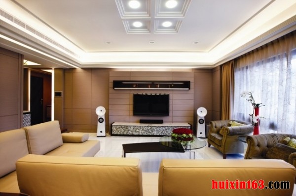 华御公馆,采用欧美风情的装修风格,在本案例的设计当中,装饰出来的效果展现的是一种奢华大气的一面,在客厅的布置中采用石膏板粘贴吊顶,空间没有繁琐复杂的吊灯装饰约束,四盏内嵌式的射灯安装,同样将客厅演绎得比较清澈明亮,背景色彩以白色为主,亮丽的地砖铺设正好起到一个上下相互呼应的效果,个性的沙发添置,鲜明的色彩反差还起到一个点缀的效果,落地窗的设计搭配上轻质的窗帘,同样让空间的采光更加的明亮,并且还能随时调节空间的采光强度,电视两旁、两台个性的音响更是展现出一种艺术的氛围,如果在适当的添置一些绿植,其装饰效果可能会更加完美。