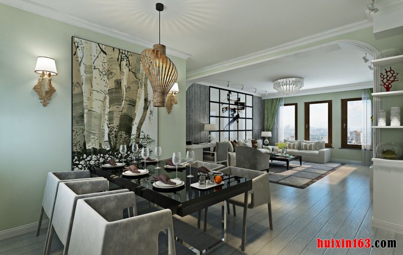 广源国际,本案例是一套别墅的装修设计,采用的是现代简约的装修风格,在客厅的装饰布置当中,平顶式的石膏板吊顶搭配上一盏华丽霸气的水晶灯吊灯,将空间演绎得比较时尚唯美,背景色彩以白色为主,在造型以及色彩的搭配上会让空间的设计变得更加的轻松自然,沙发背景墙后就是窗户的设计,不仅起到一个装饰空间的作用,而且空间的照明程度变得更加的明亮透彻,个性的电视背景墙,是一个雕花屏风的设计,在视觉效果上让空间显得比较有创意感,一颗绿植的添加摆放更是突出一种艺术的氛围,整个空间的背景墙都以浅青色的色彩为主,更是展现出一种惬意舒适的感觉。