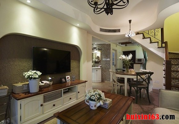 本案例采用的是美式风格的装修风格,整个空间的装饰布置,没有做太多的修饰,却展现出一种温馨与舒适,在客厅的装饰布置当中,所占用的空间面积并不是很大,但却显得比较独特别致,造型独特的吊顶设计,背景色彩以白色为主,搭配上一盏黑色的铁艺吊灯,让空间显得比较唯美、浪漫,精致的电视背景墙更是客厅设计的一大亮点所在,造型独特,两盏射灯的安装,若影若现的灯光效果,更是演绎出一种朦胧美感,开放式的餐厅设计,让这个空间显得更加具有创意,餐厅设计在楼梯下,圆形的餐桌造型,体现出一种合家团圆的意境,一束花卉的添加更是将餐厅的美展现得淋漓尽致。